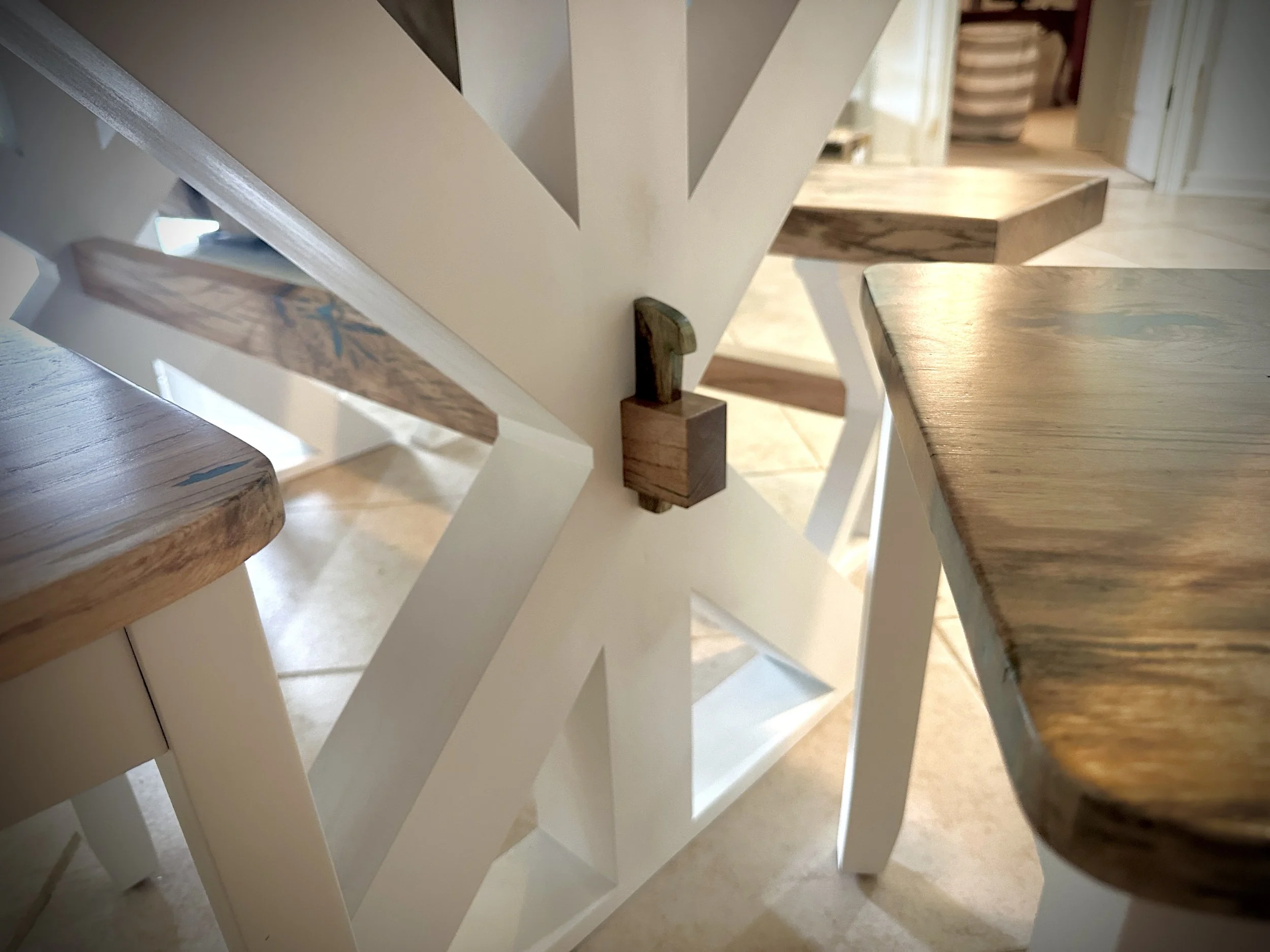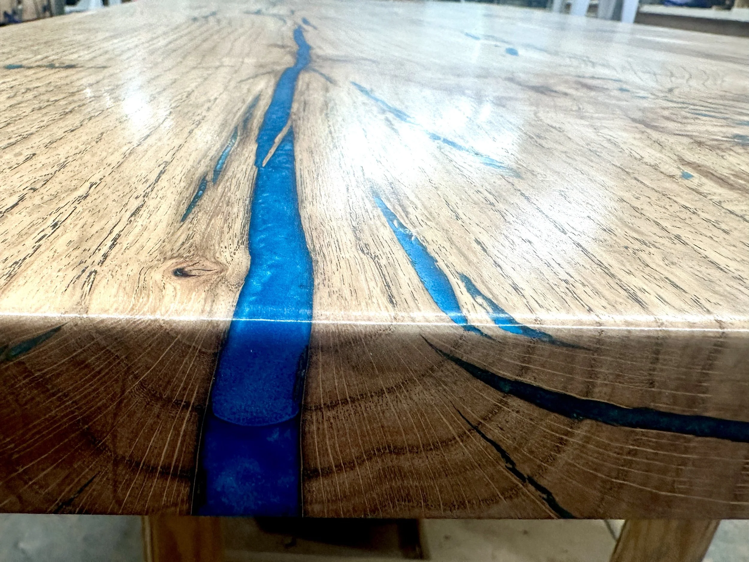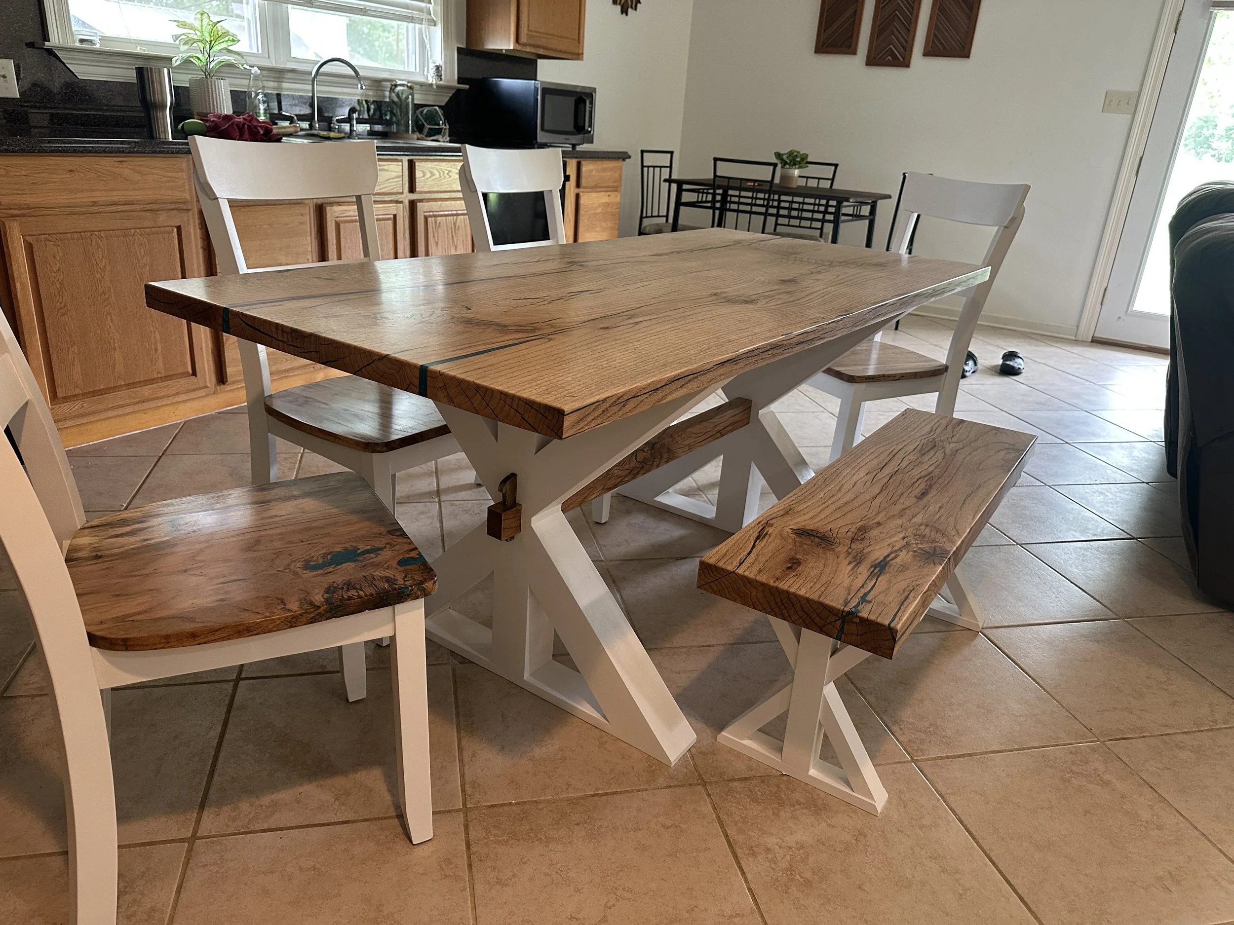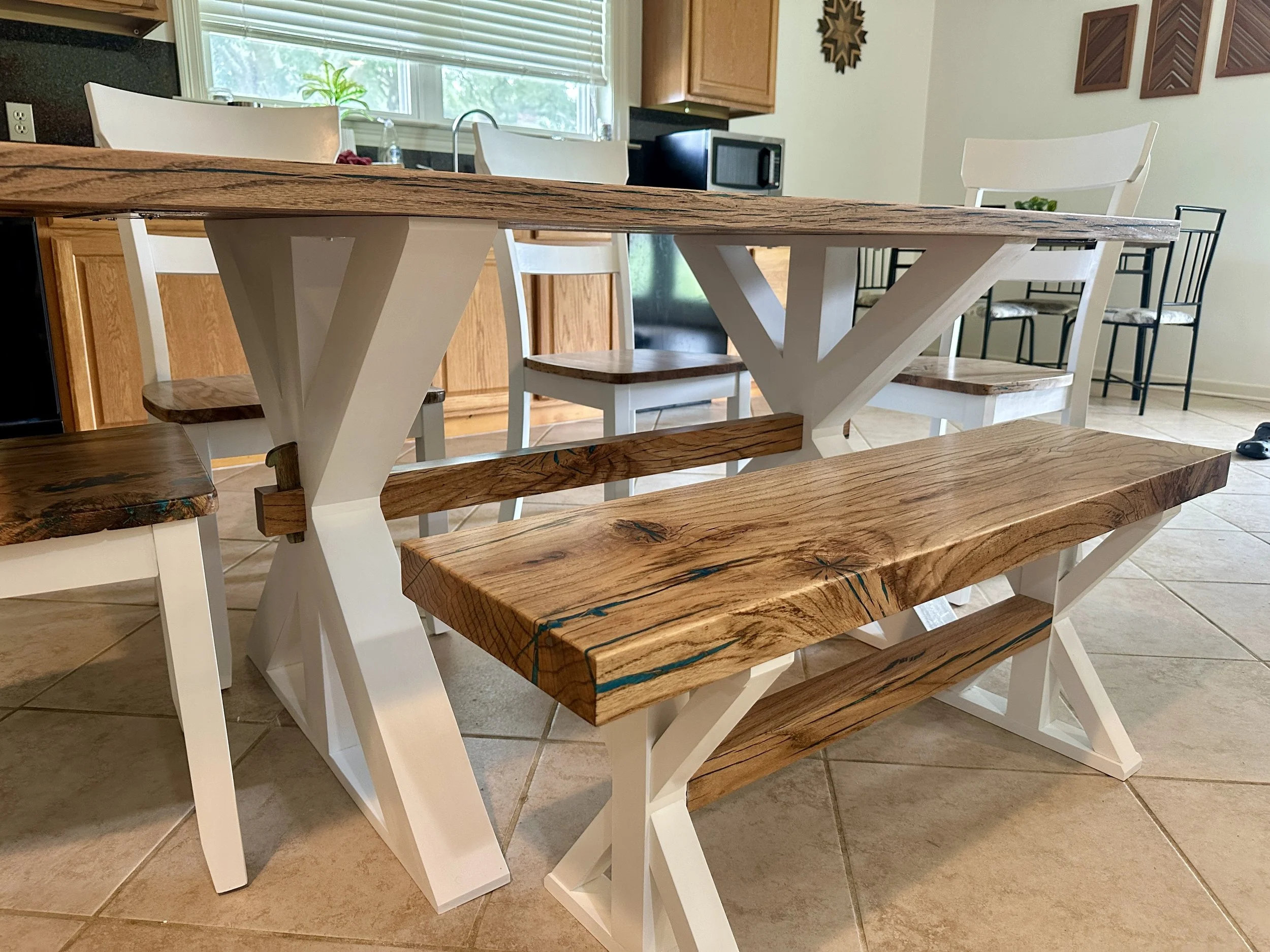 This eccentric dining table showcases book-matched oak slabs, highlighting the wood’s unique grain pattern. Natural cracks are filled with turquoise epoxy, creating a striking contrast against the warm oak grain. The farmhouse-style base is crafted with hand cut traditional tusked mortise-and-tenon joints, allowing the table to be assembled or broken down for transport without the use of hardware. The set is completed with a matching bench made from the same slab and complementary handcrafted chair seats and two couch tables, tying the design together as a cohesive, functional centerpiece.